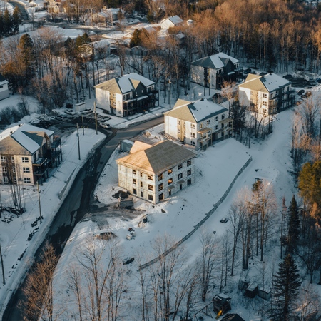 Construction de 6 immeubles de 6 logements sur un site escarpé et boisé.